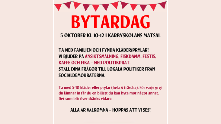 Tid: 5 oktober kl 10-12Plats: Karbyskolans matsal TA MED FAMILJEN OCH FYNDA KLÄDER/PRYLAR!VI BJUDER PÅ ANSIKTSMÅLNING, FISKDAMM, FESTIS, KAFFE OCH FIKA – MED POLITIKPRAT. STÄLL DINA FRÅGOR TILL LOKALA POLITIKER FRÅN SOCIALDEMOKRATERNA. Ta med 5-10 prylar (hela & fräscha). För varje plagg får du en biljett du kan byta mot något annat. Det som blir…